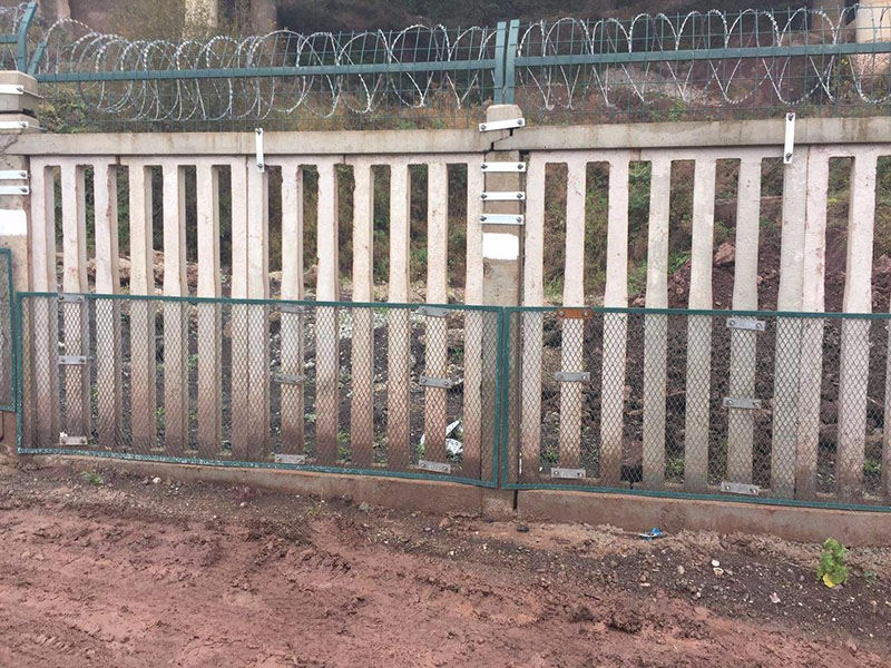 鋼筋混凝土立柱金屬網片防護柵欄由立柱、網片及連接部件組成,防護高度1.8m。根據國家要求,安平縣帝順絲網有限公司特生產有通線2012-8001和通線2012-8002兩種國標產品,為鐵路線路提供安全防護。